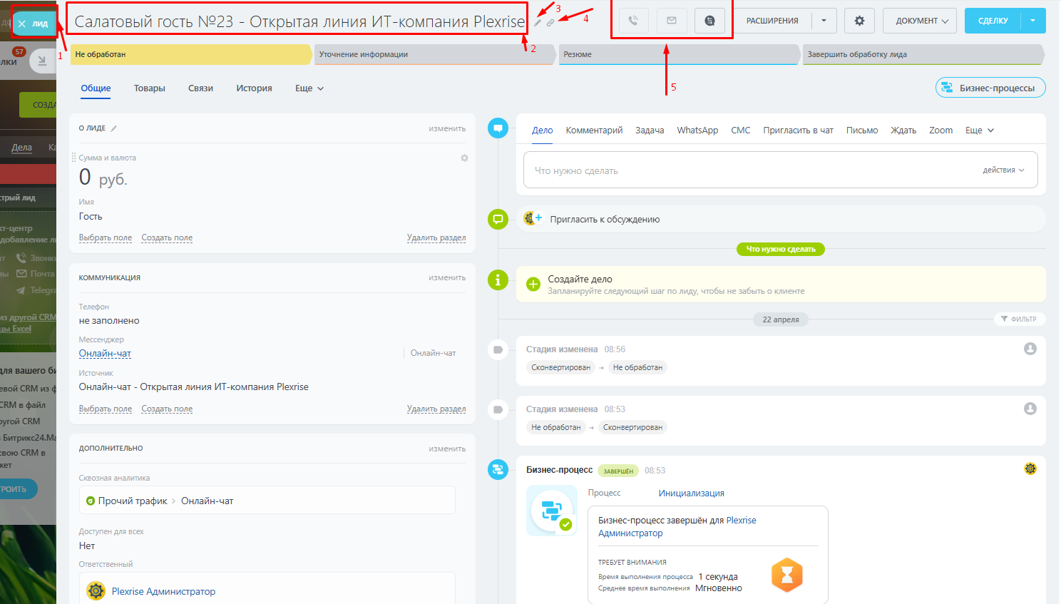 Сменить стадию. Перемещайте лиды по стадиям по ходу работы с клиентом. Например, когда связались с клиентом, переместите лид со стадии В работе на стадию Обработан. Сделать это можно в канбане или в карточке CRM.