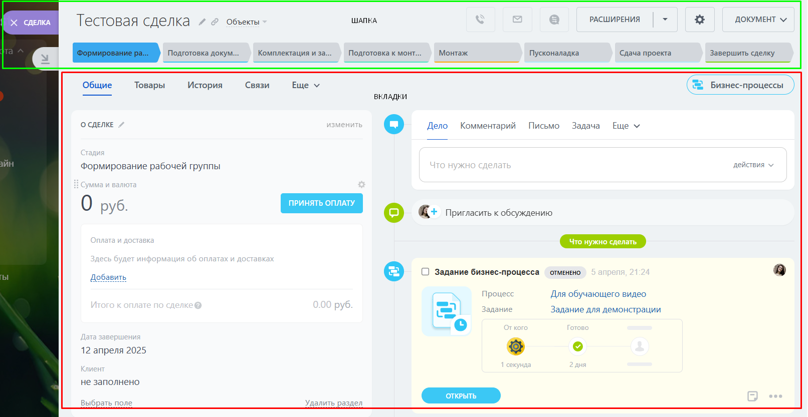 - Доступные вкладки (история, связи, бизнес-процессы, смарт-процессы).