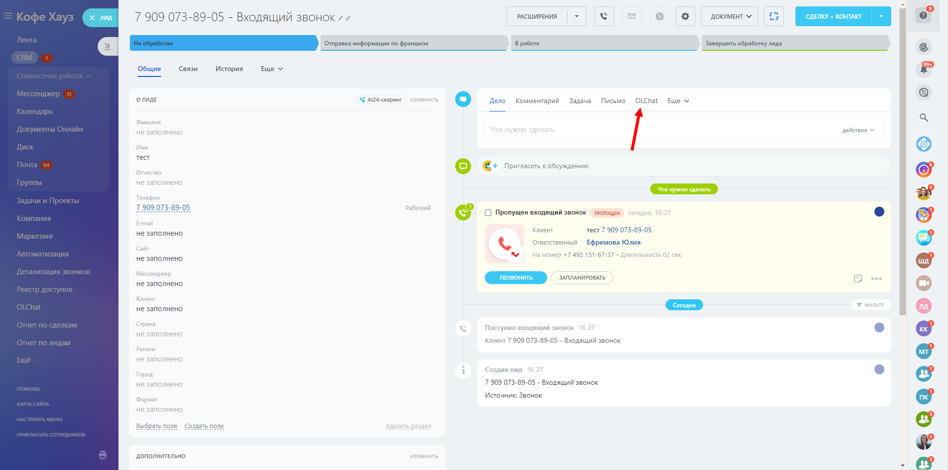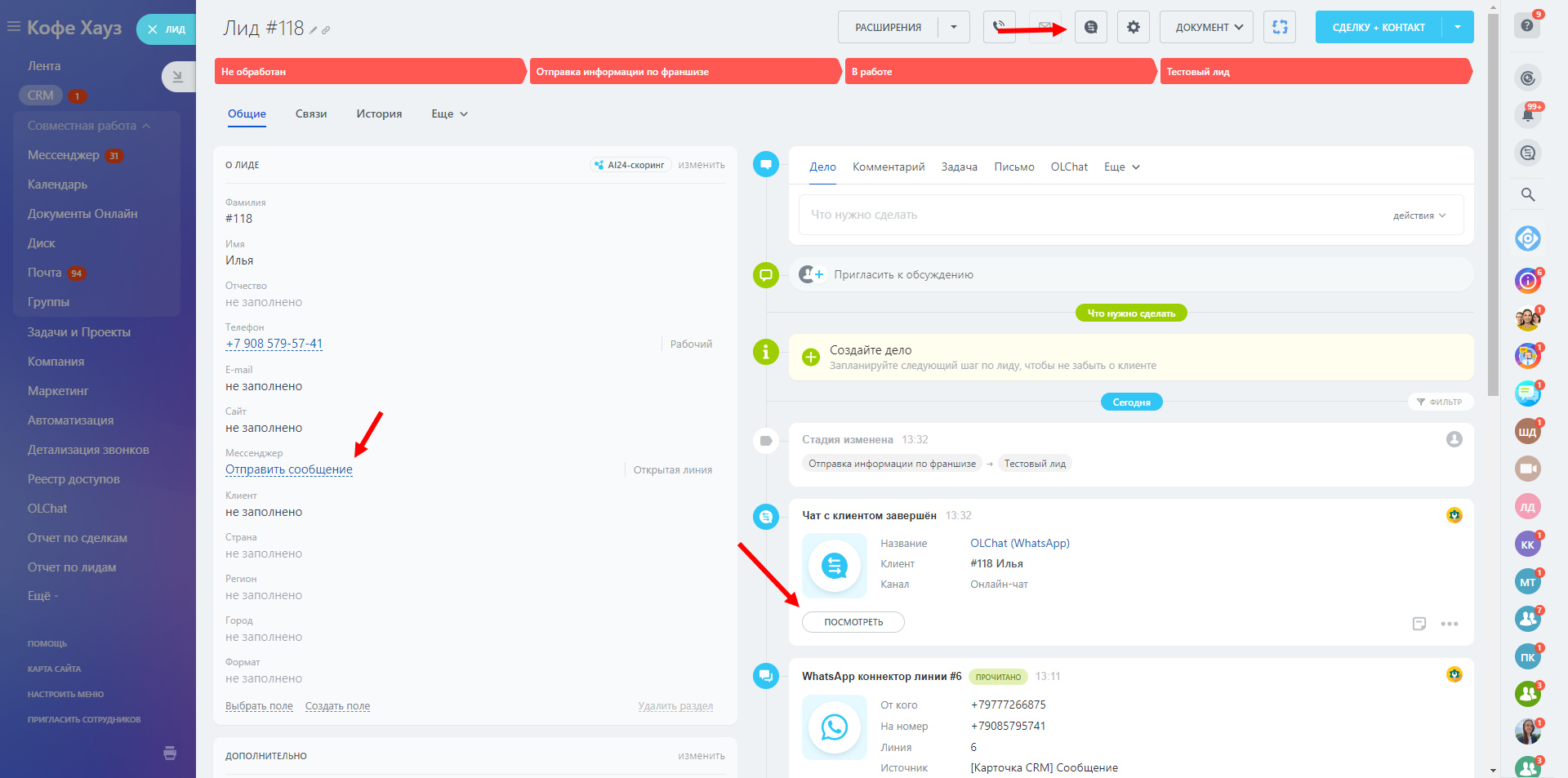 Для того, чтобы написать партнеру в WhatsApp зайдите в карточку лида (компании, контакта, сделки) и нажмите на кнопку "OLChat" в тайм-лайне карточки.