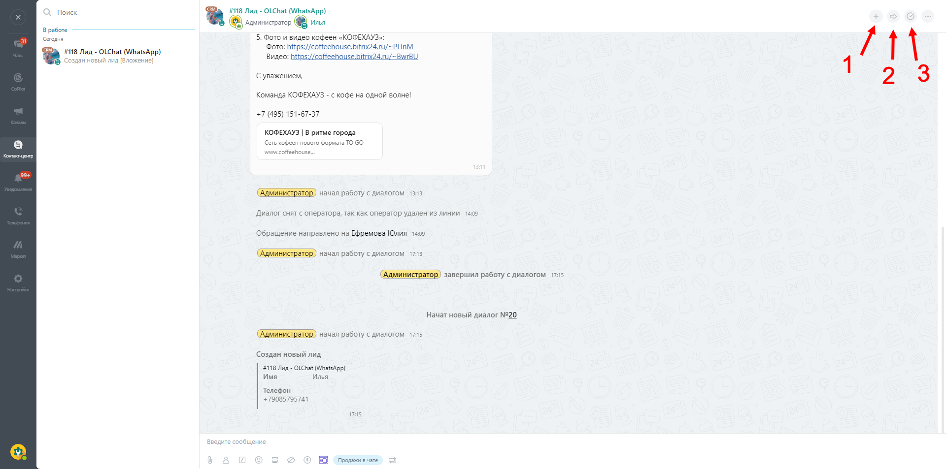 В чате есть кнопки для быстрого добавления сотрудников компании в чат (кнопка №1), для перевода чата на другого сотрудника компании (кнопка №2) и для завершения диалога (кнопка №3).