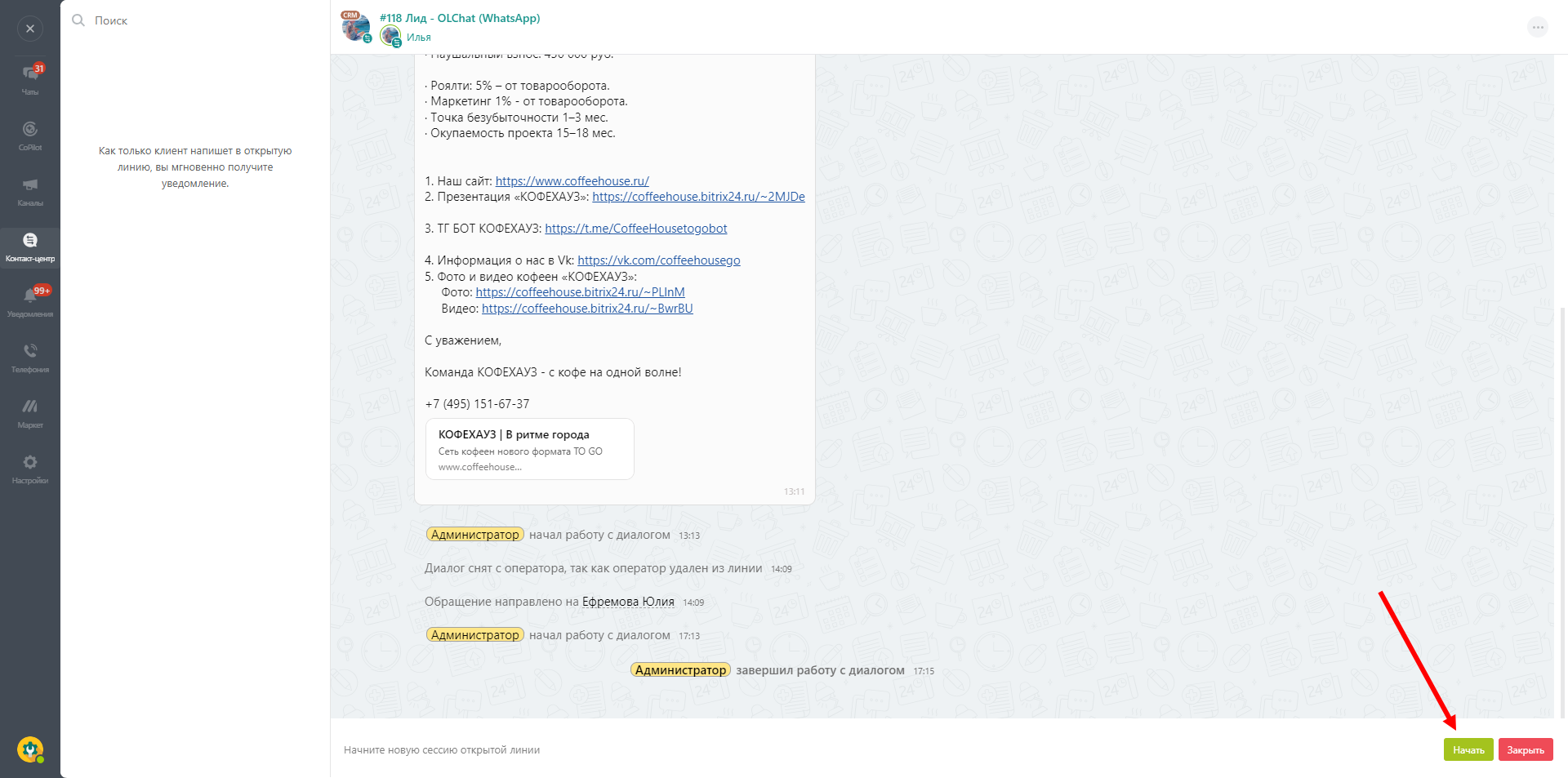 Чтобы продолжить общение с клиентом достаточно нажать на иконку чата в карточке контакта, лида или сделки или на кнопку «ОТКРЫТЬ».