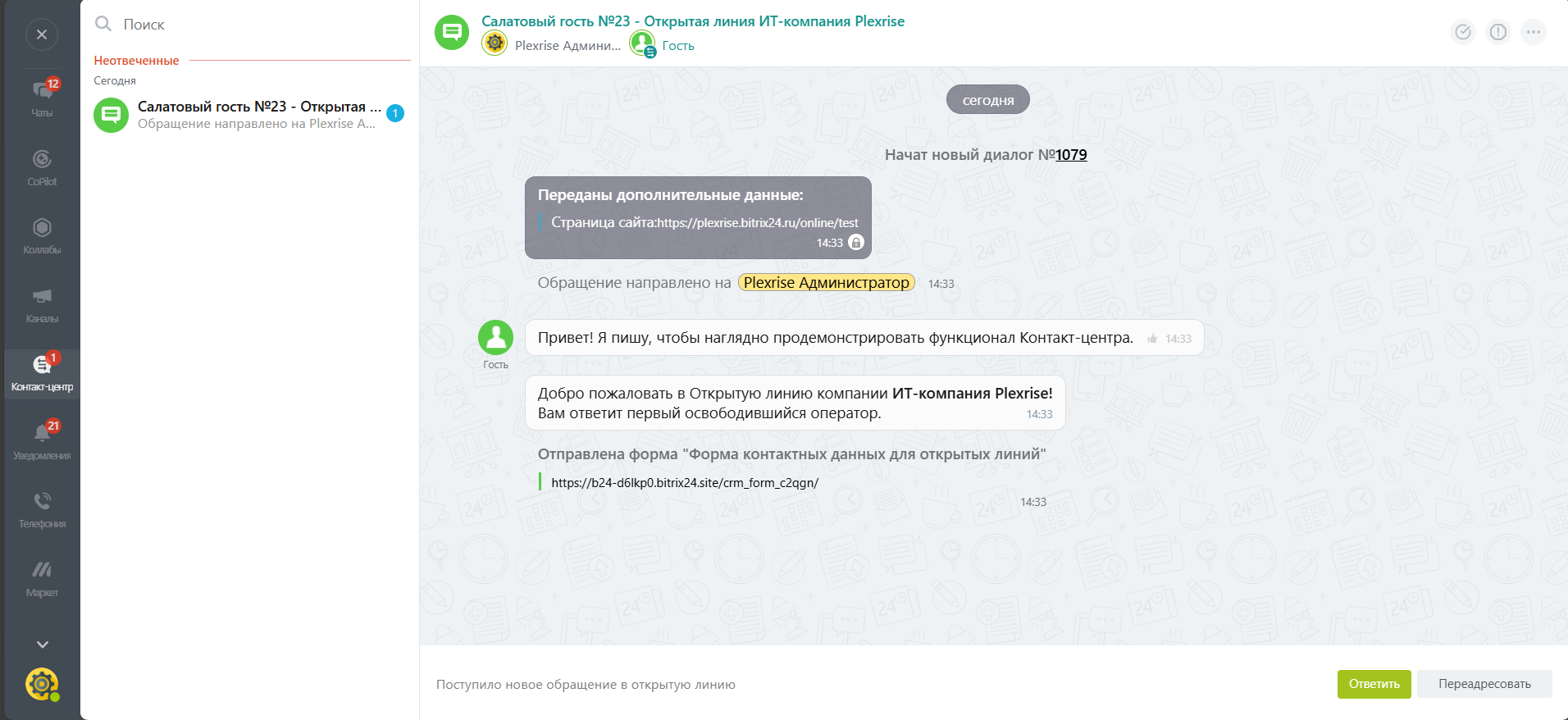 Общение с клиентом происходит через стандартный функционал открытых линий Битрикс24.