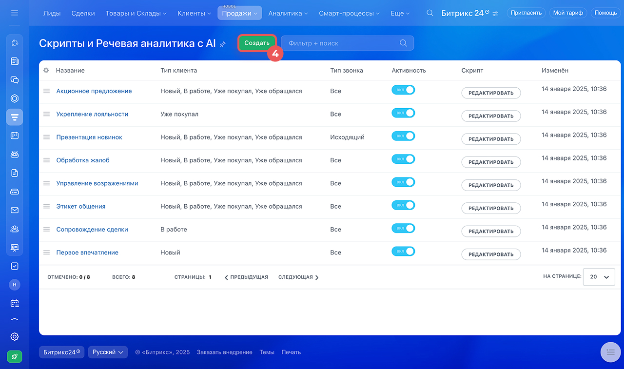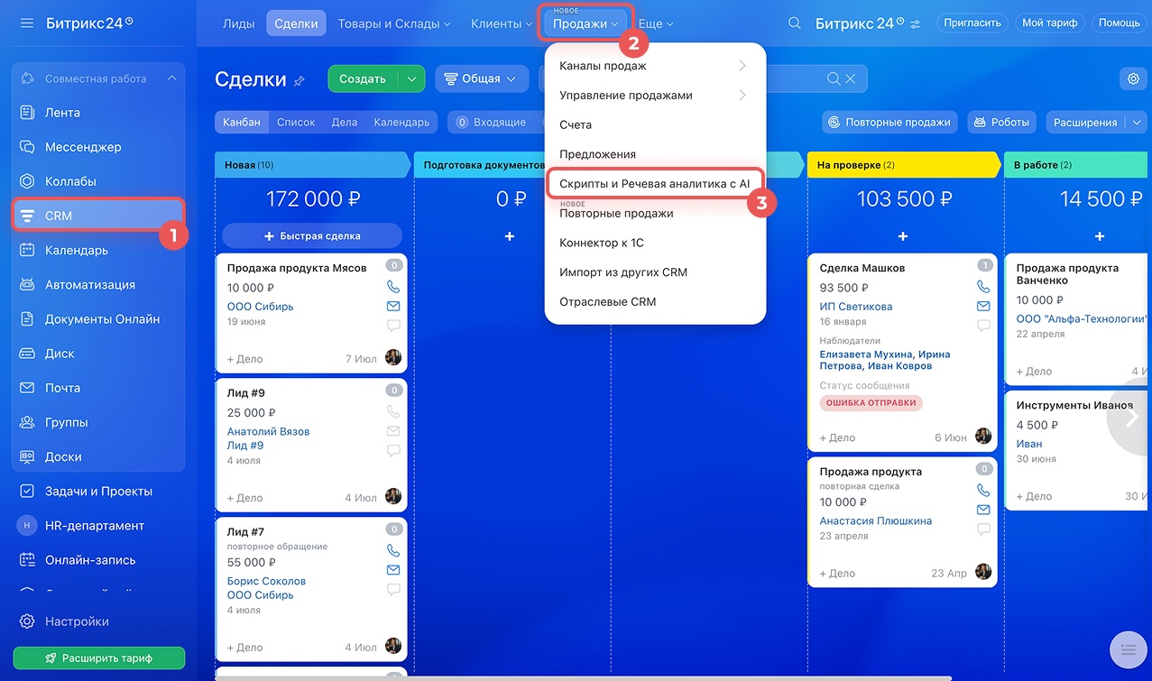 Перейдите в раздел "CRM" > "Продажи". Выберите "Скрипты и Речевая аналитика с AI".