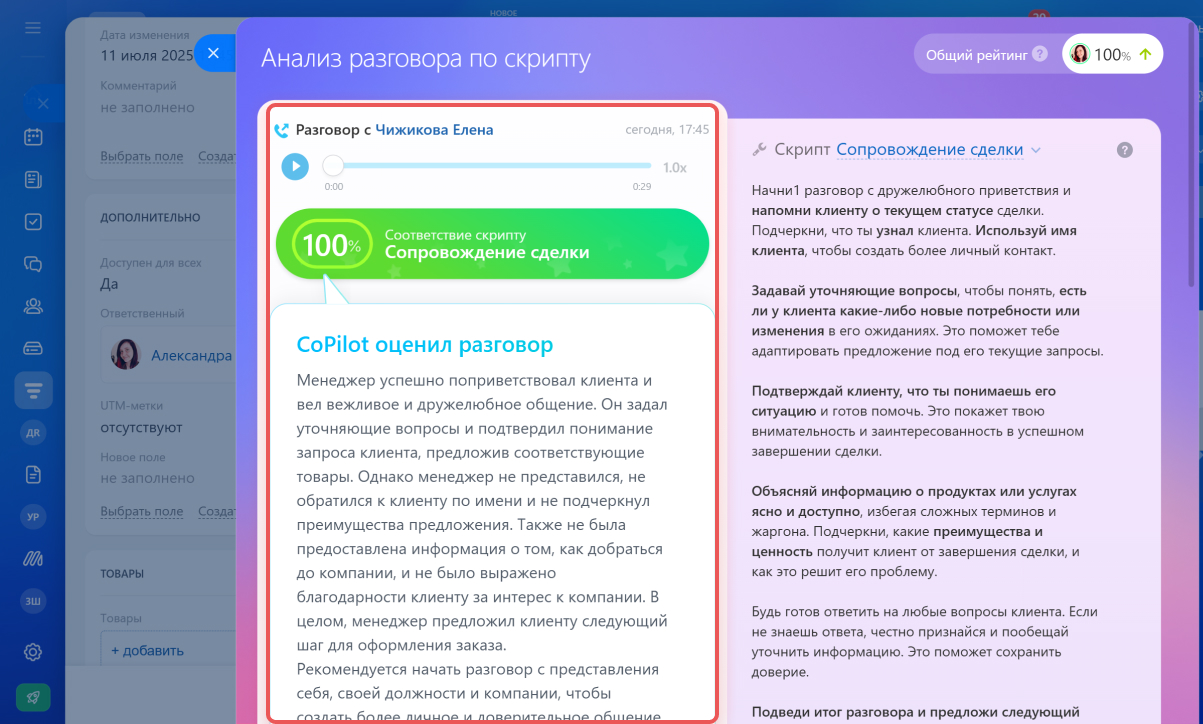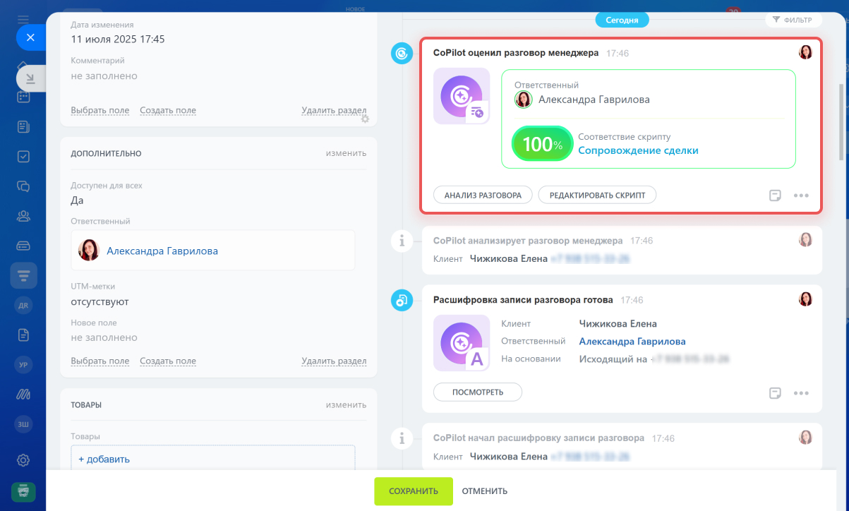 Когда CoPilot проанализирует разговор, в таймлайне появится дело. В нем можно увидеть оценку, выбранный скрипт, ответственного сотрудника и подробный анализ звонка.
