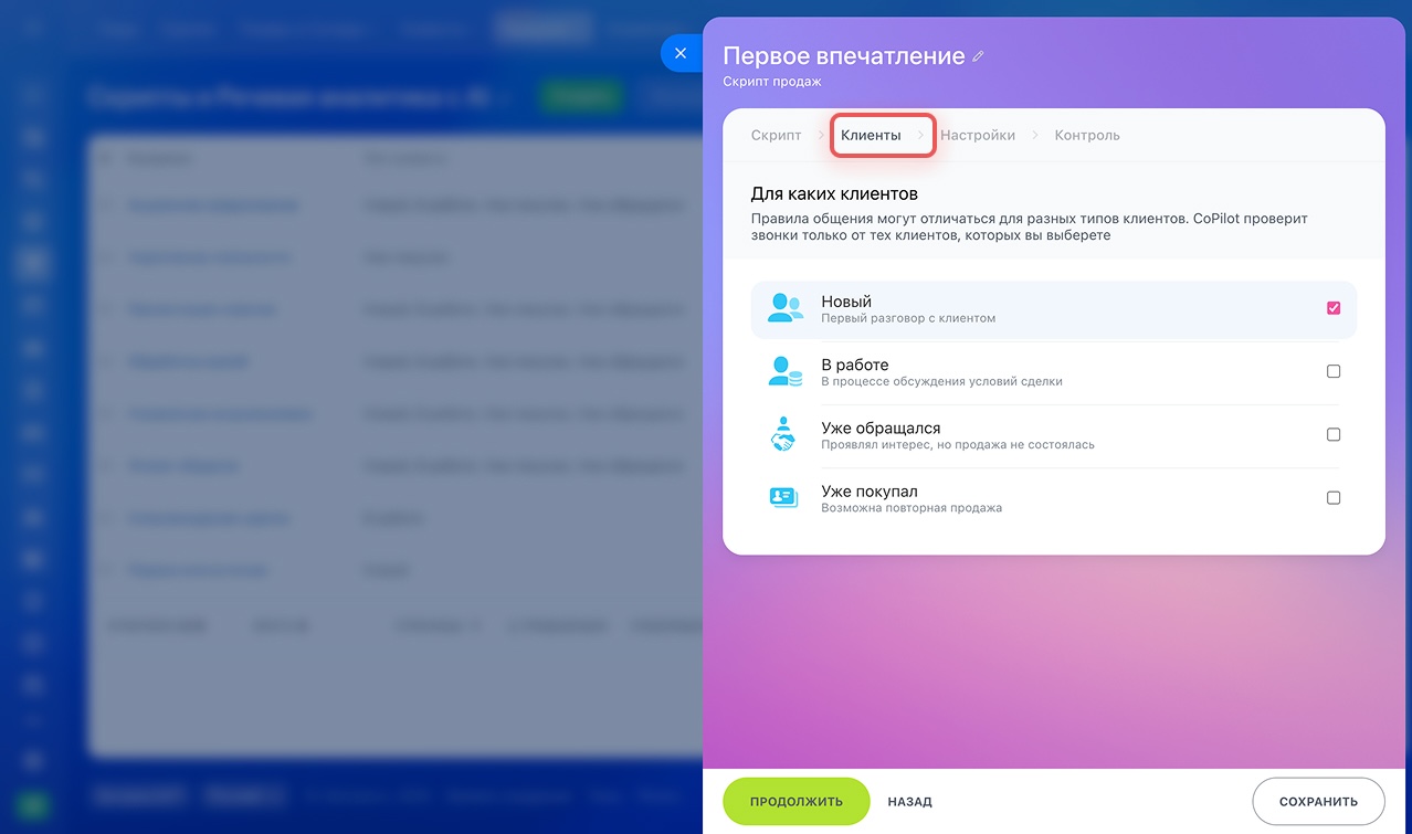 Укажите тип клиента. Выберите, для каких типов клиентов будет работать этот скрипт: