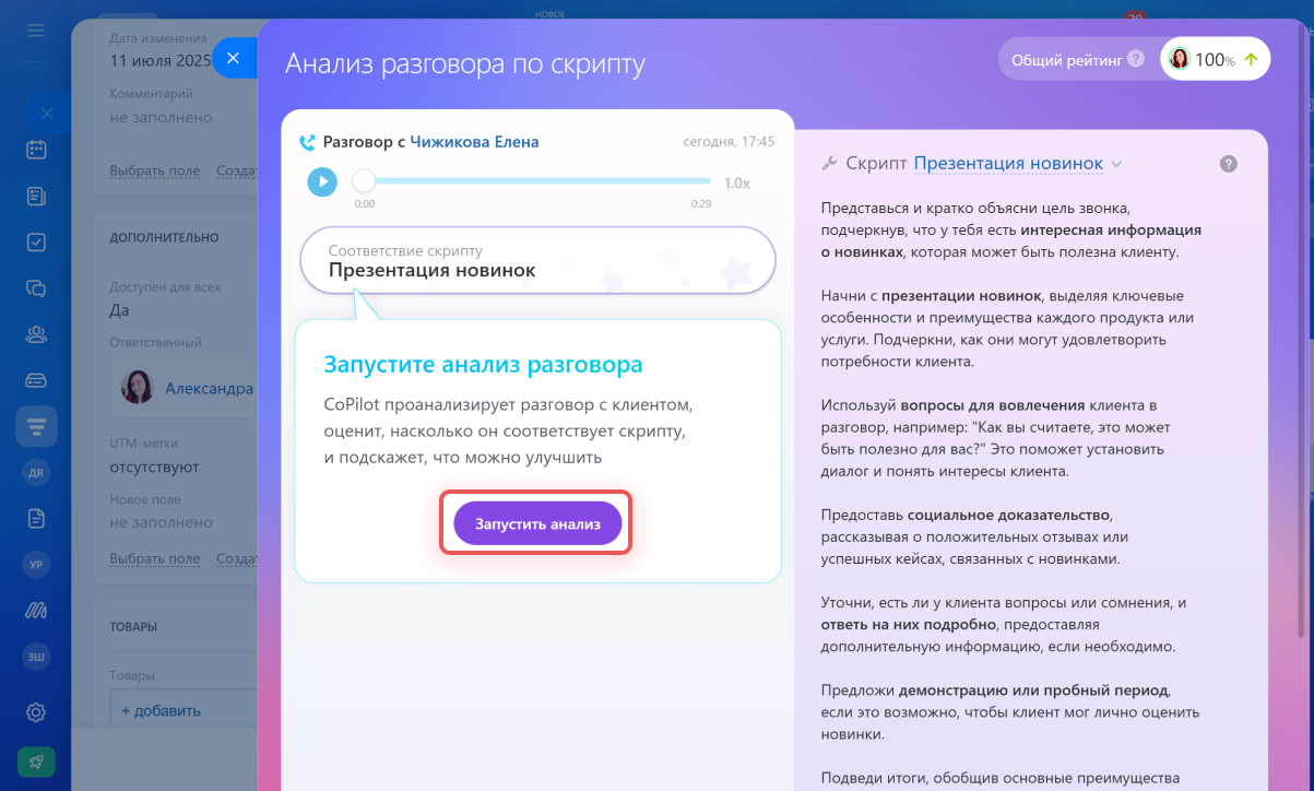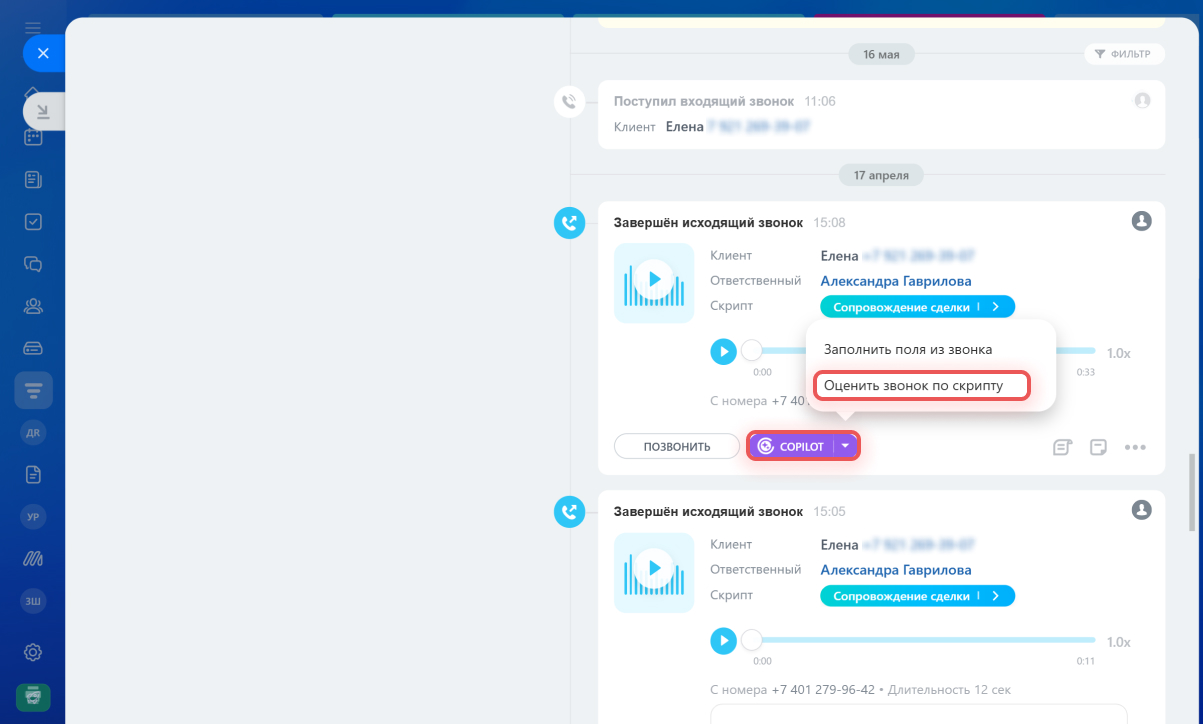 Если поля в карточке CRM заполнять не надо, нажмите на кнопку CoPilot и выберите действие "Оценить звонок по скрипту".