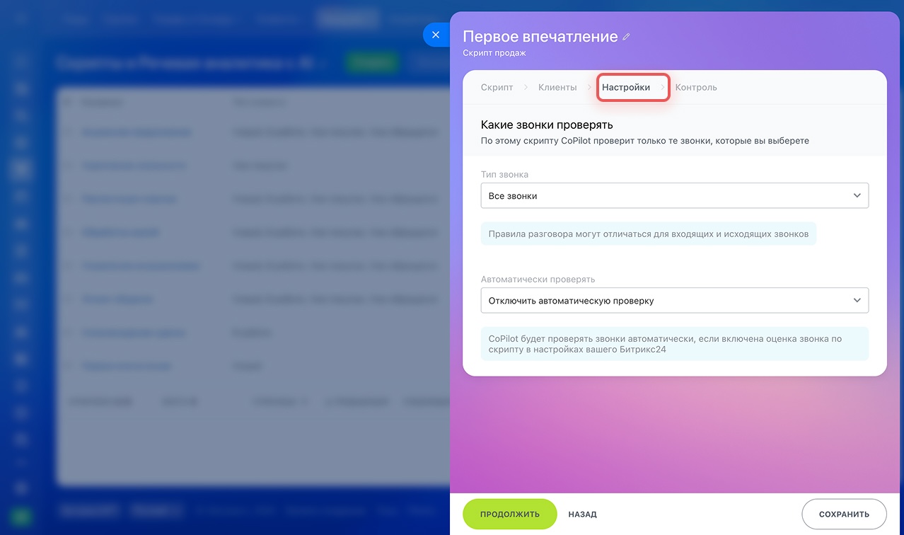 Укажите, для каких звонков будет автоматически запускаться проверка CoPilot: