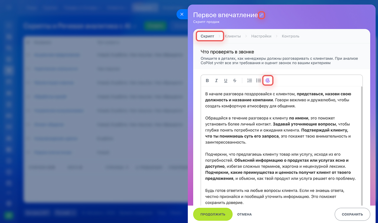 Напишите подробно, как менеджеры должны разговаривать с клиентами. При анализе CoPilot учтет эти требования и оценит звонок по вашим критериям. Текст скрипта можно составить с помощью CoPilot. Для этого нажмите на кнопку CoPilot (круглая фиолетовая кнопка) и введите запрос.