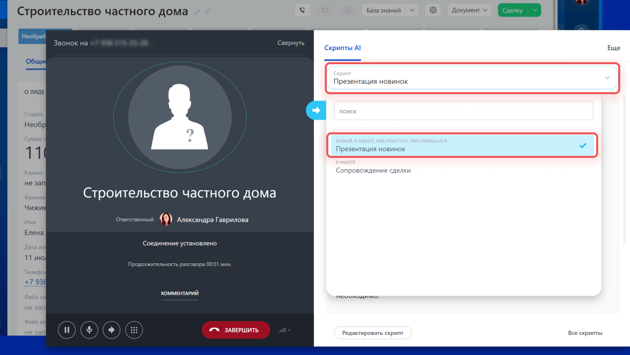В окне звонка автоматически открывается скрипт, который подходит для определенного типа клиента. Например, когда звонит клиент, которого нет в CRM, менеджер видит скрипт для нового клиента. Можно выбрать другой скрипт, например, если постоянный клиент звонит с нового номера.