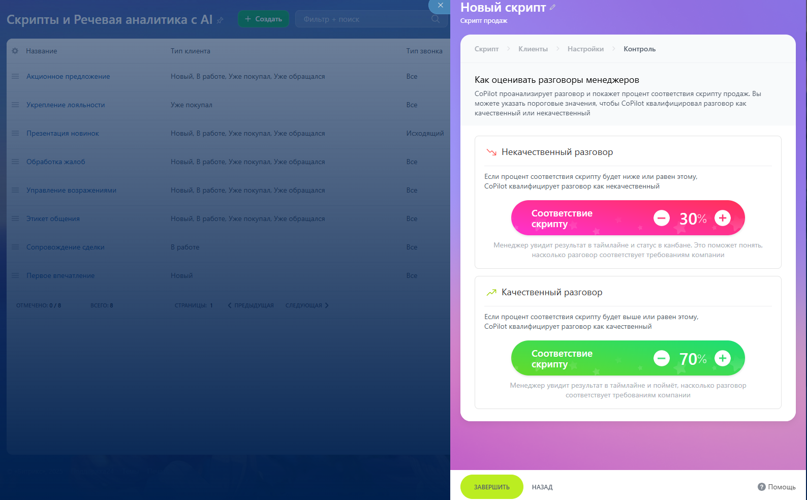 На вкладке "Контроль" можно настроить пороги оценки разговора для Copilot`a. Лучше оставить настройки как есть, т.к. в данном случае настройка оптимальна.